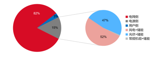 数据显示,截至2023年1月,国内已经投运的电化学储能电站累计装机主要分布在电网侧,占比接近80%,其次是电源侧,占比15%,最后是用户侧,占比为3%。在电源侧中,风电+光伏配储占比约99%。